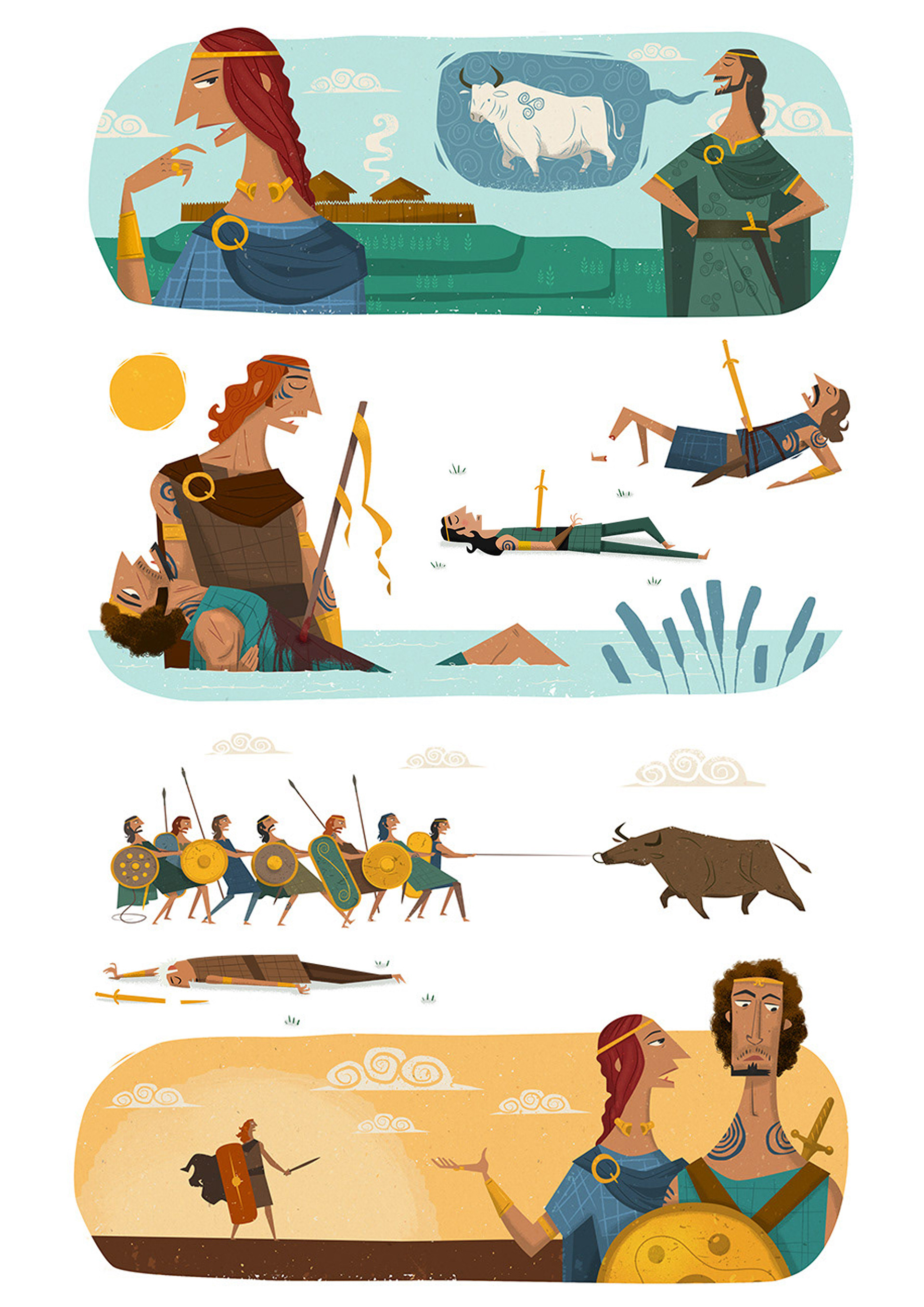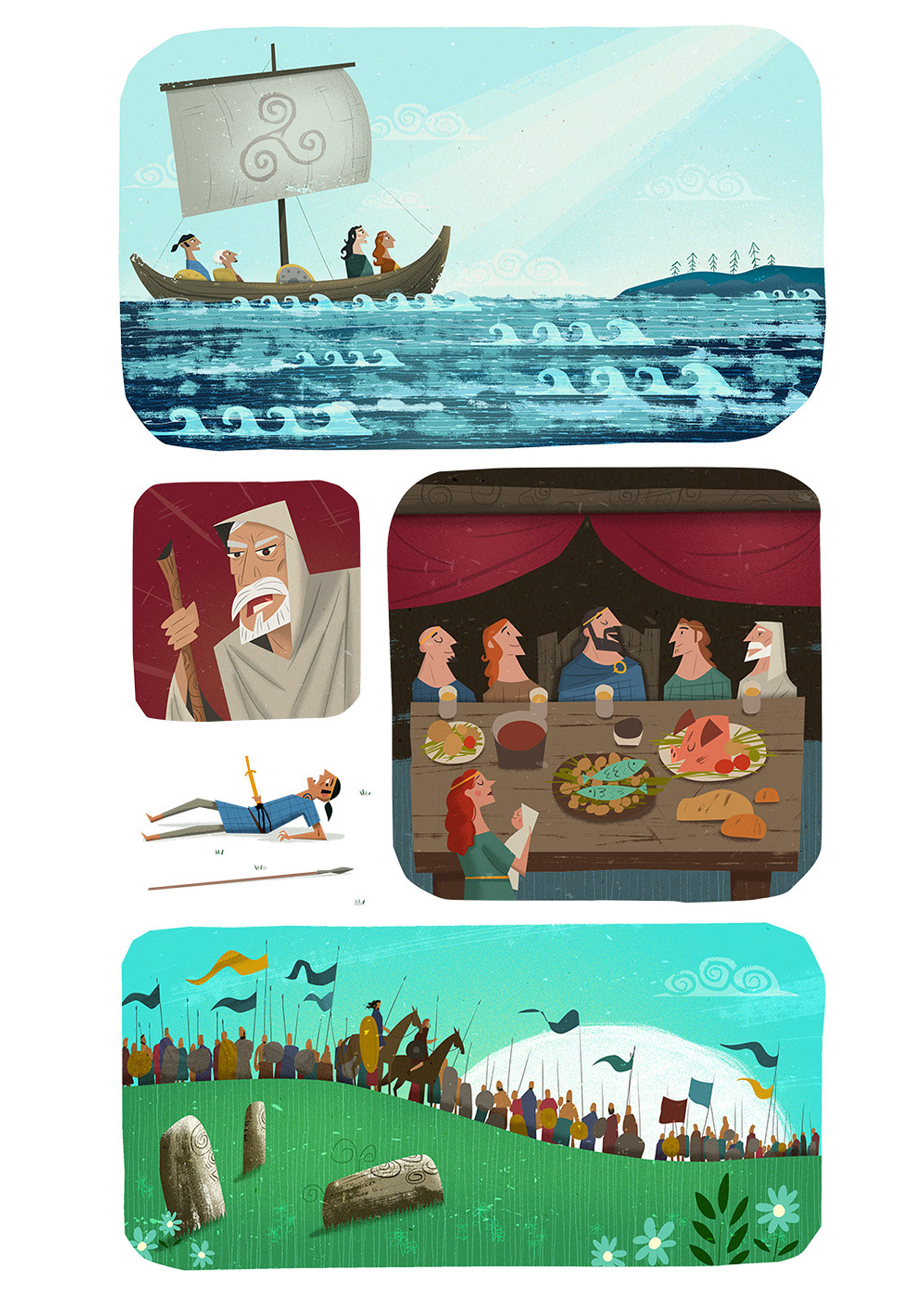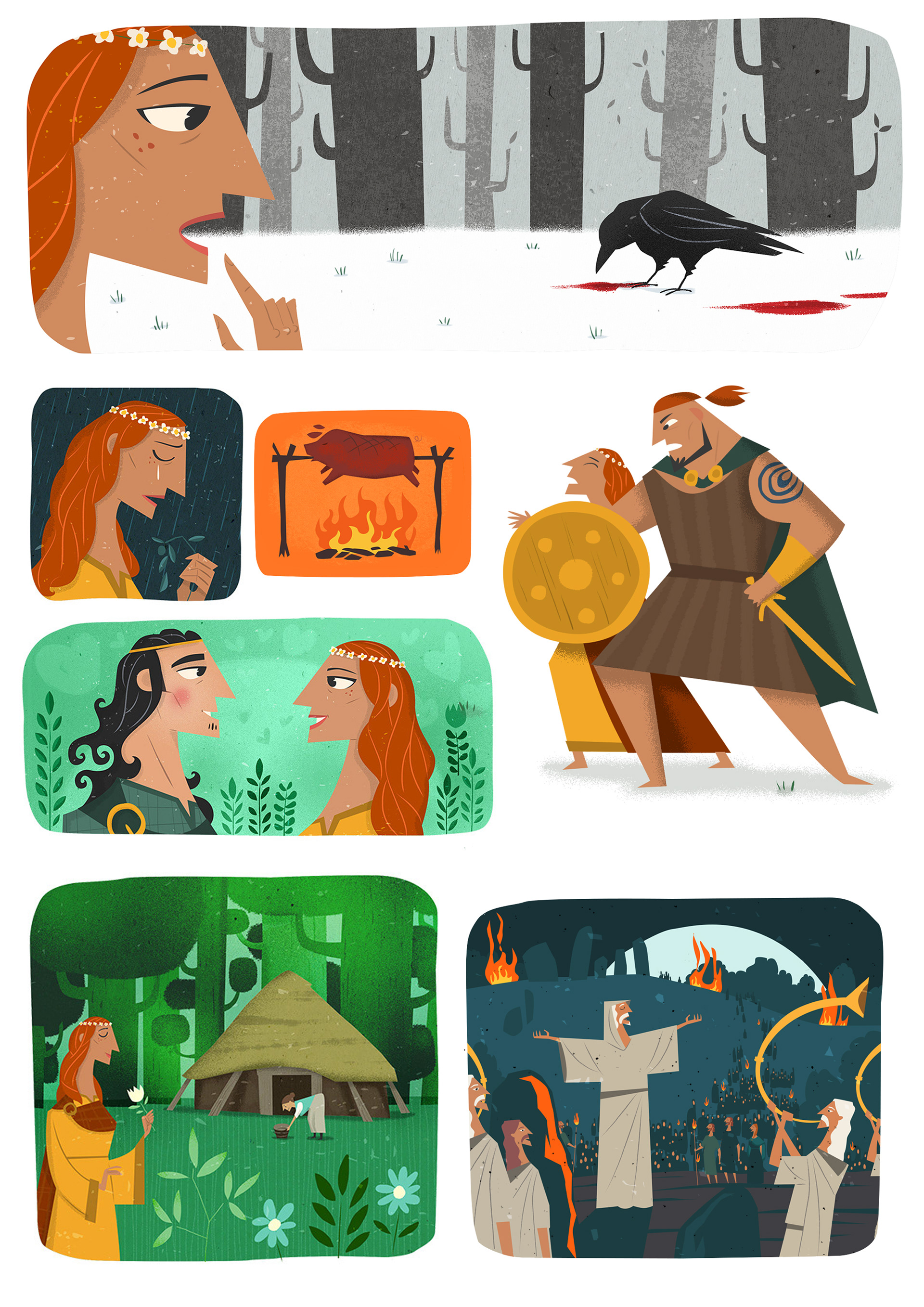 Below are a selection of illustrations I made for a series of Celtic stories. The first set illustrate the story of Deirdre and Naoise (aka Deirdre of the Sorrows) and the second set, The Cattle Raid of Cooley. Both stories are set in Pre-Christian Ireland and are part of the rich folklore of Irish storytelling. The panels are shown in a random order.