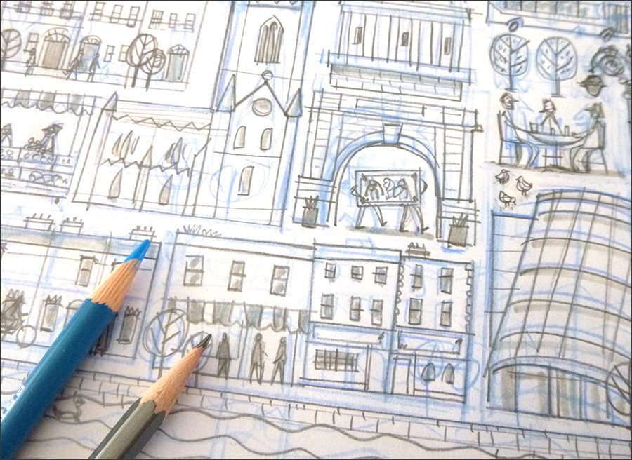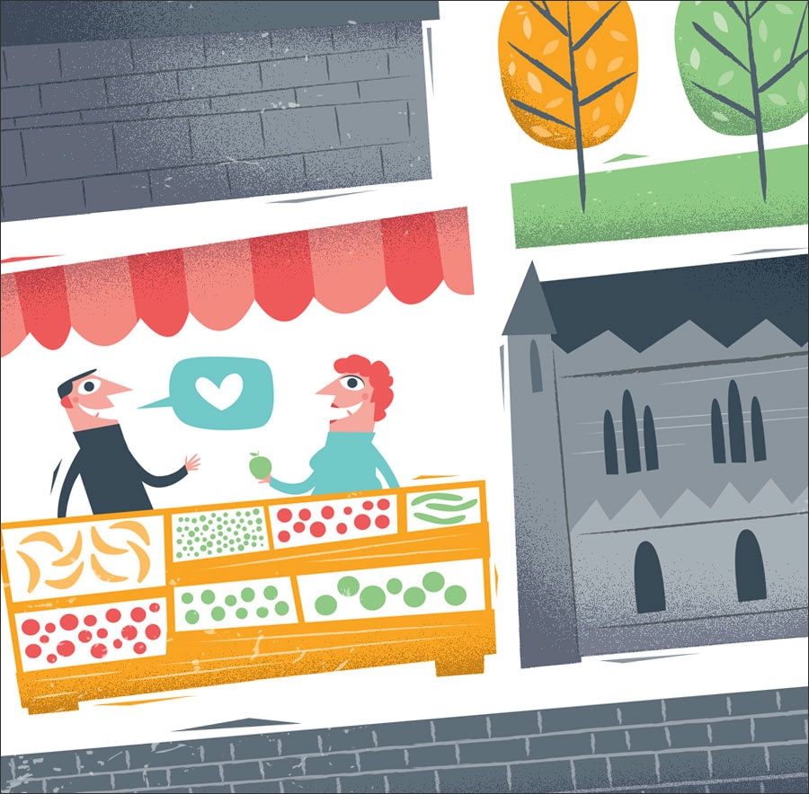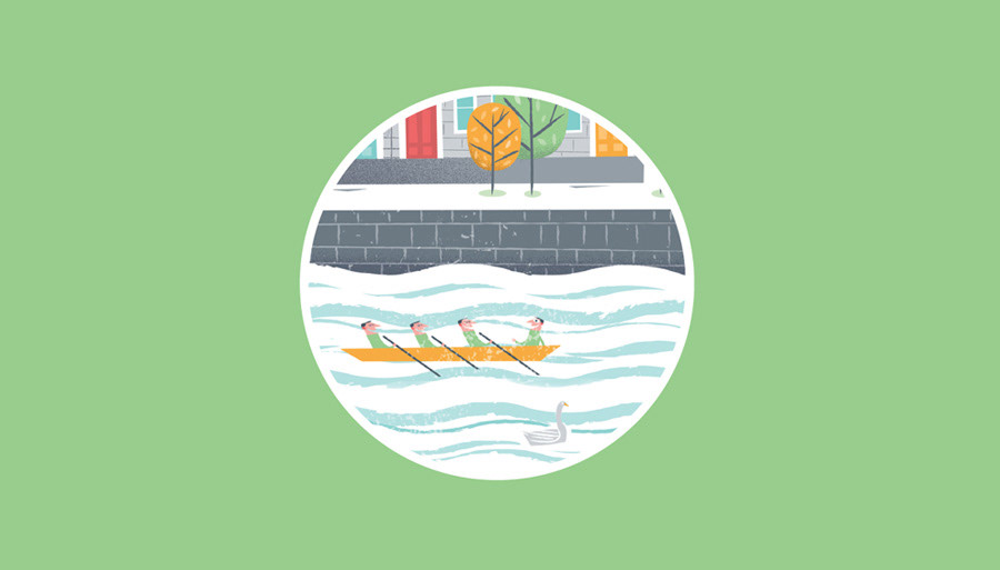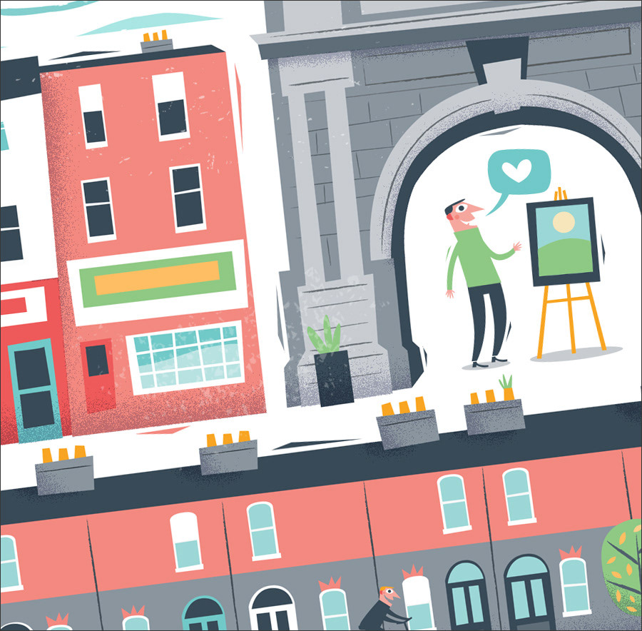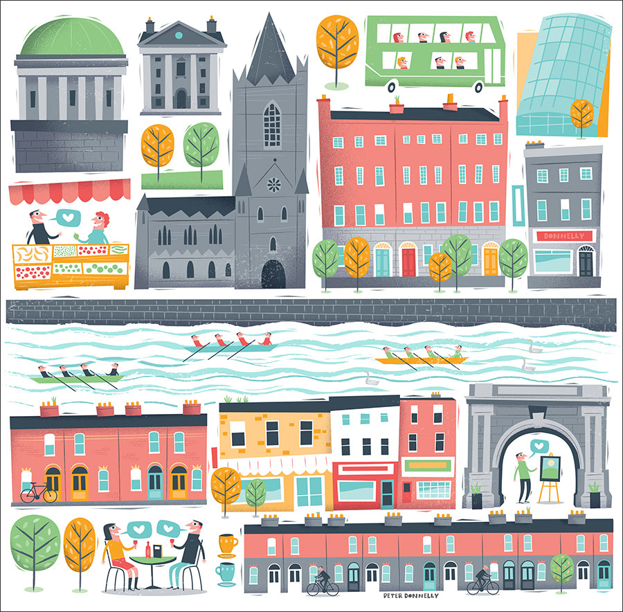 An editorial piece illustrating the city of Dublin and it's charm. This was a slight departure for me as I had to work with the Airbnb brand colours which are very different to my usual palette. The city is divided by a river and the elements in the illustration represent some iconic architecture found in the city as well as street level scenes.