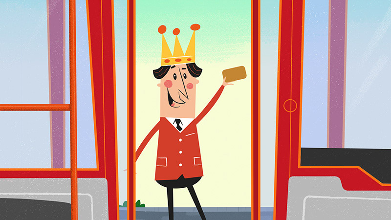 Young drew influence from Warrington’s Golden Gates as the backstory for the concept, developing a king Midas character who one day locks eyes with a beautiful girl on the bus. Different days of the week and tongue-in cheek miss-happenings are then used to convey the benefits of using the Midas card as the king struggles to get to his love interest, always on the same bus.