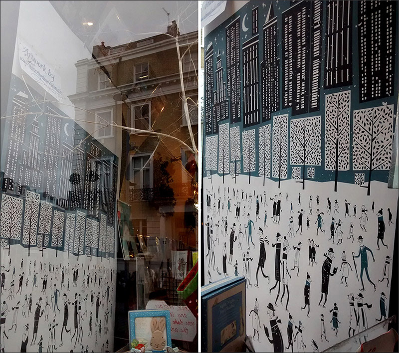 Christmas decoration in The Medici Gallery window, South Kensington, London.