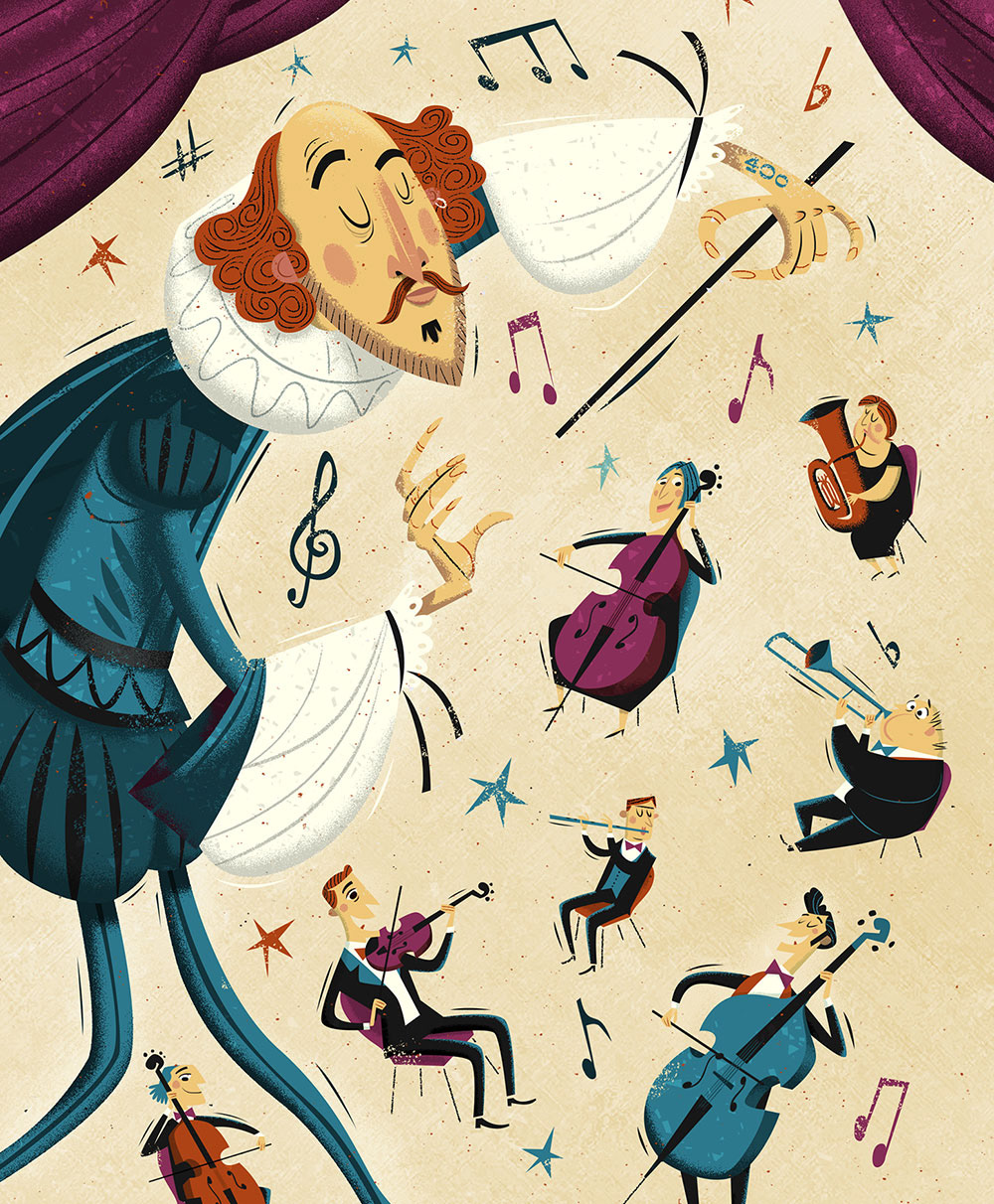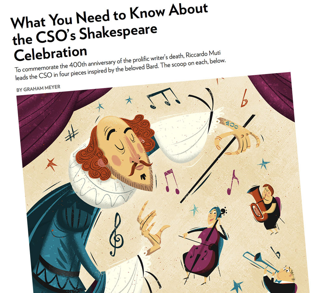 Editorial Illustration for Chicago Magazine. A story about the 400th anniversary of Shakespeare’s death and the Chicago Symphony Orchestra performing four of Shakespeare’s pieces to mark the occasion.