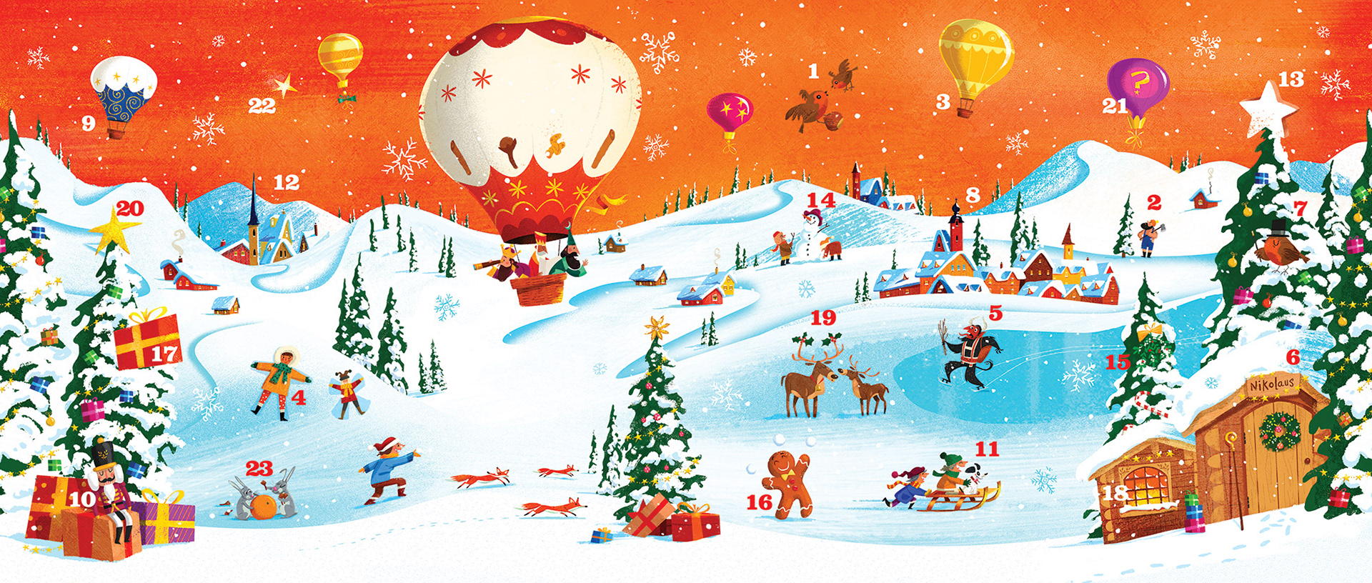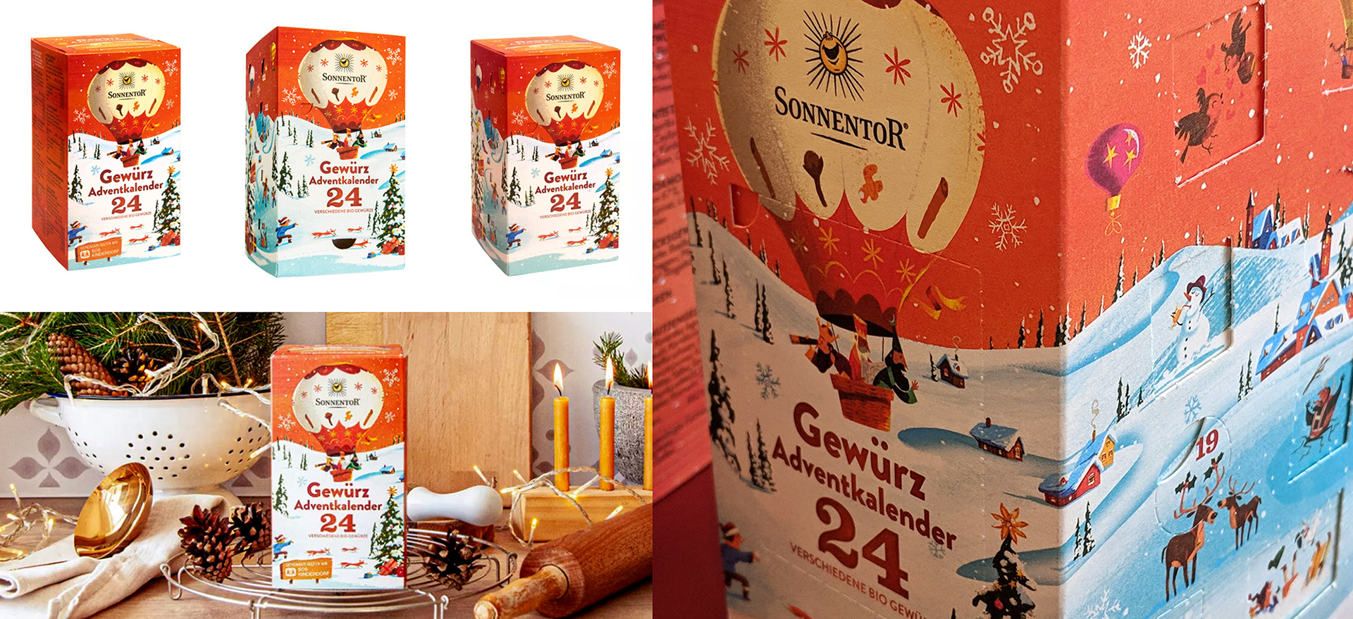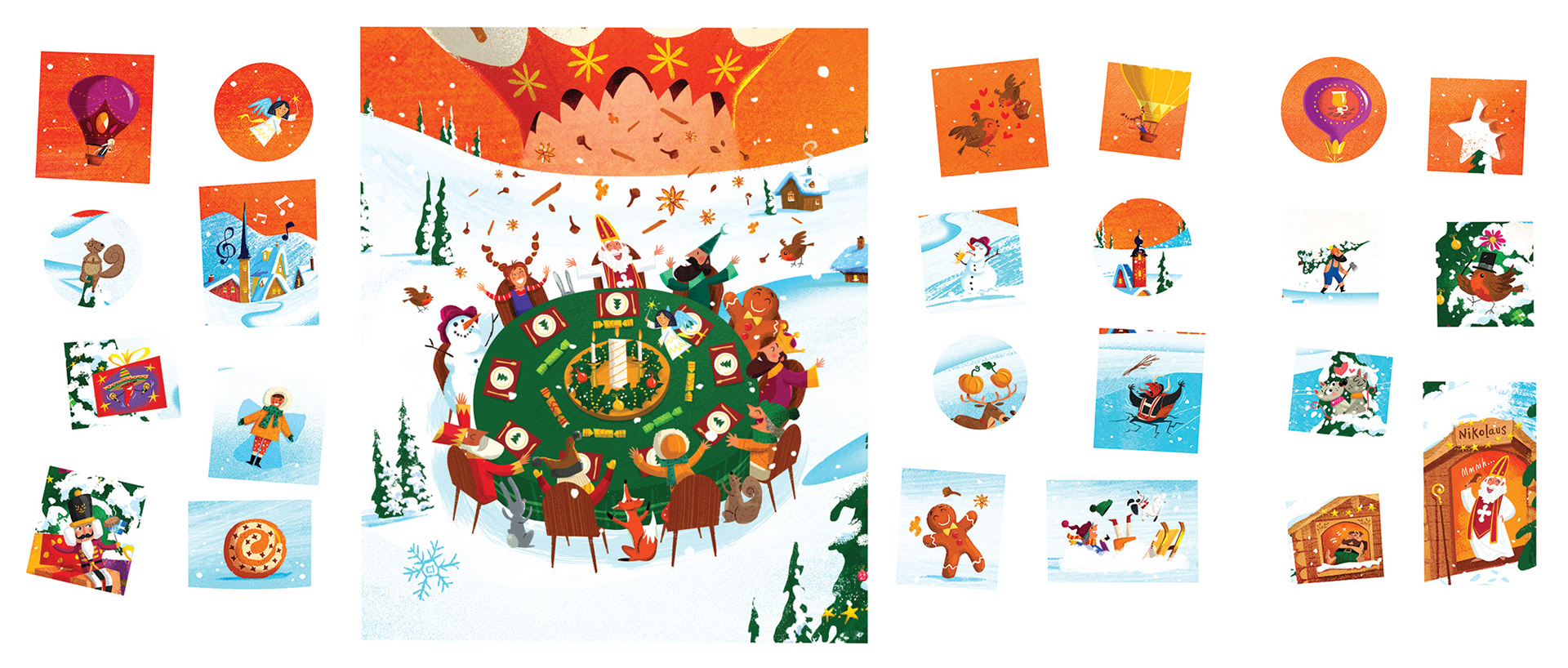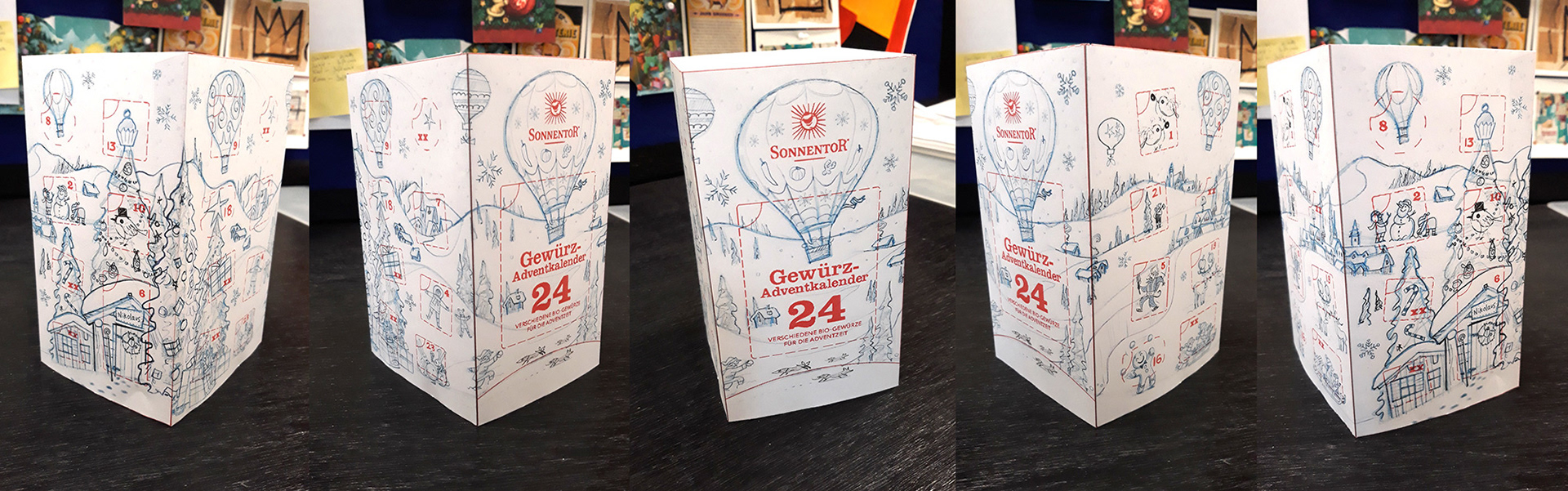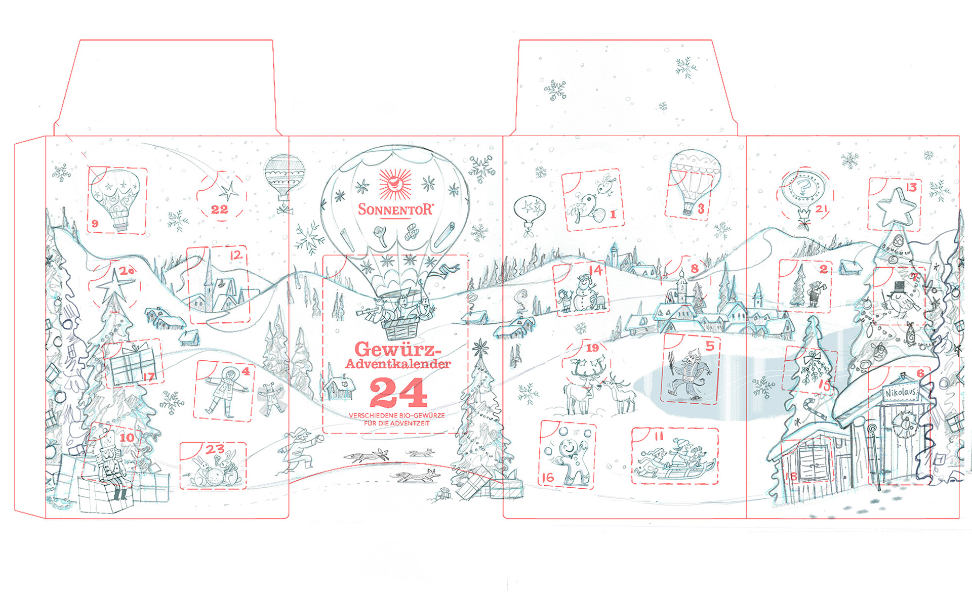 An advent box containing 25 different cooking spices. Each date is peeled back to reveal a different image below similar to a chocolate advent box. The images below include sketched layout, mock up box, inside flaps and close-ups of the final artwork.